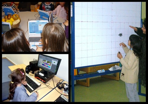Outras histórias, outros alunos... 1.º e 3.º anos (três turmas trabalhando em conjunto com as três professoras... porque os pequeninos de 1.º ano não têm computadores), já depois da primeira exploração livre (em pequeno grupo - um aluno de 1.º ano e dois de 3.º) do Scratch – onde o x e o y estão sempre presentes, foram convidados a deitar-se no chão da Biblioteca, olhando o teto, para escutar a história de Descartes – que um dia (doente) na sua cama a olhar uma mosca no teto... concebeu a ideia de um referencial. Depois... o pedido: tentar descobrir maneiras de indicar aos amigos a posição da sua mosca imaginária no teto. Primeiro diziam: “a minha está ali”, “a minha está aqui”, “a minha é mais ali”..., até que um fez a observação que os encaminhou para a descoberta: “Mas assim com ‘ali’ e ‘aqui’ eu não sei onde estão as vossas moscas!”... “Ah! E tem de haver um centro!” (exclamação de outro). Aos poucos começaram a usar as placas quadrangulares da cobertura do teto para esboçarem uma localização intuitiva (“está no quinto quadrado do lado da porta”)… ainda com falhas. Mais tarde, com uma parte do referencial desenhado (apenas positivos) tiveram de pensar... o que acontecia “para trás da origem do eixo X e para baixo da origem do eixo Y” (isto é, para trás e para baixo do centro). Depois de várias hipóteses... colocaram os mesmos valores mas no sentido contrário... Só que a certa altura um deles pediu para localizar um ponto indicando x e y e... havia duas posições possíveis para ele... Desafiados a resolver o problema... apareceram os números negativos (neste caso: assinalar com o sinal menos a diferença entre uns números e outros, mesmo sem compreender realmente todo o significado)... Um lembrou-se dos elevadores que levam ao parque de estacionamento... abaixo do piso zero. Outro das temperaturas negativas. São alunos de 1.º e 3.º anos... e este conteúdo – referencial cartesiano – seria, e é, trabalhado apenas no 7.º ano...